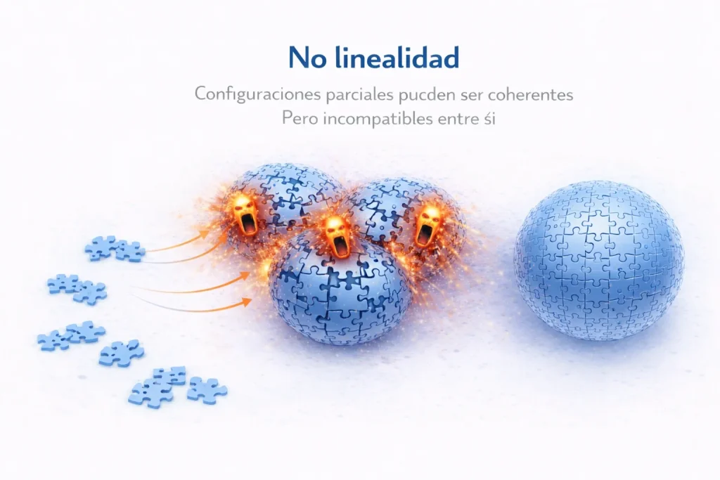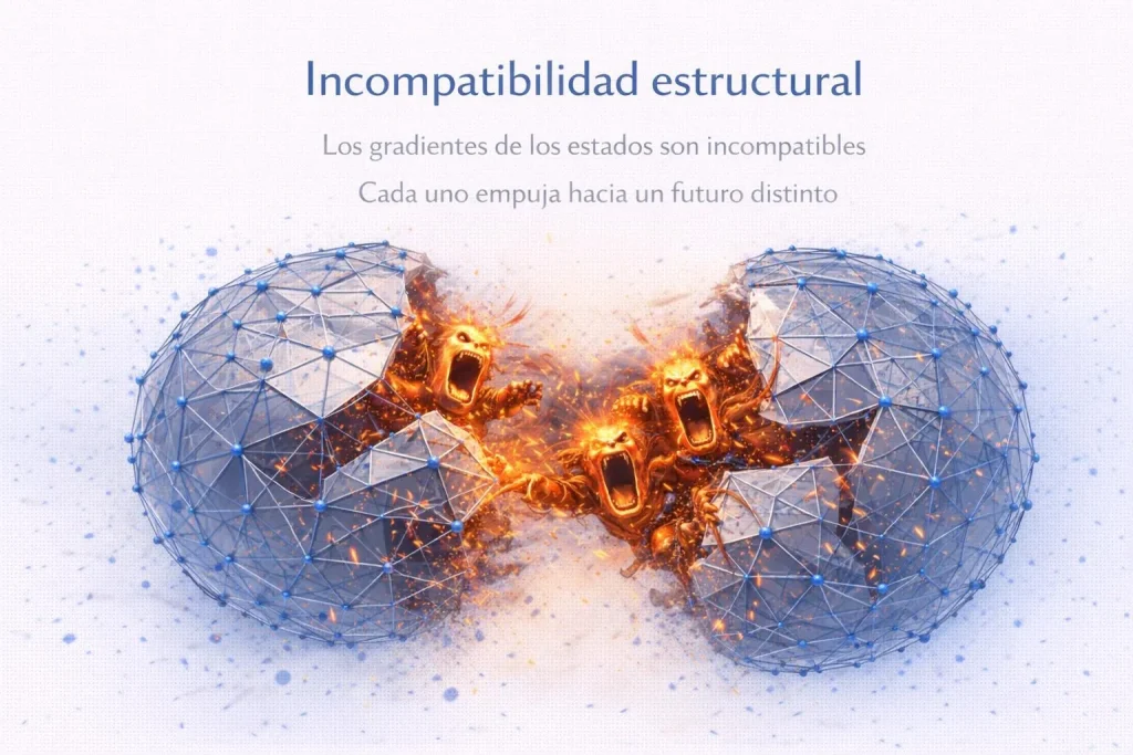 Sin embargo, cuando los estados empiezan a exigir condiciones que no pueden cumplirse simultáneamente, la configuración entra en una situación distinta. No es que una parte falle, sino que el conjunto deja de encajar. Las decisiones necesarias en un punto generan imposibilidades en otro. Lo que el sistema necesita para avanzar contradice lo que su estructura permite.