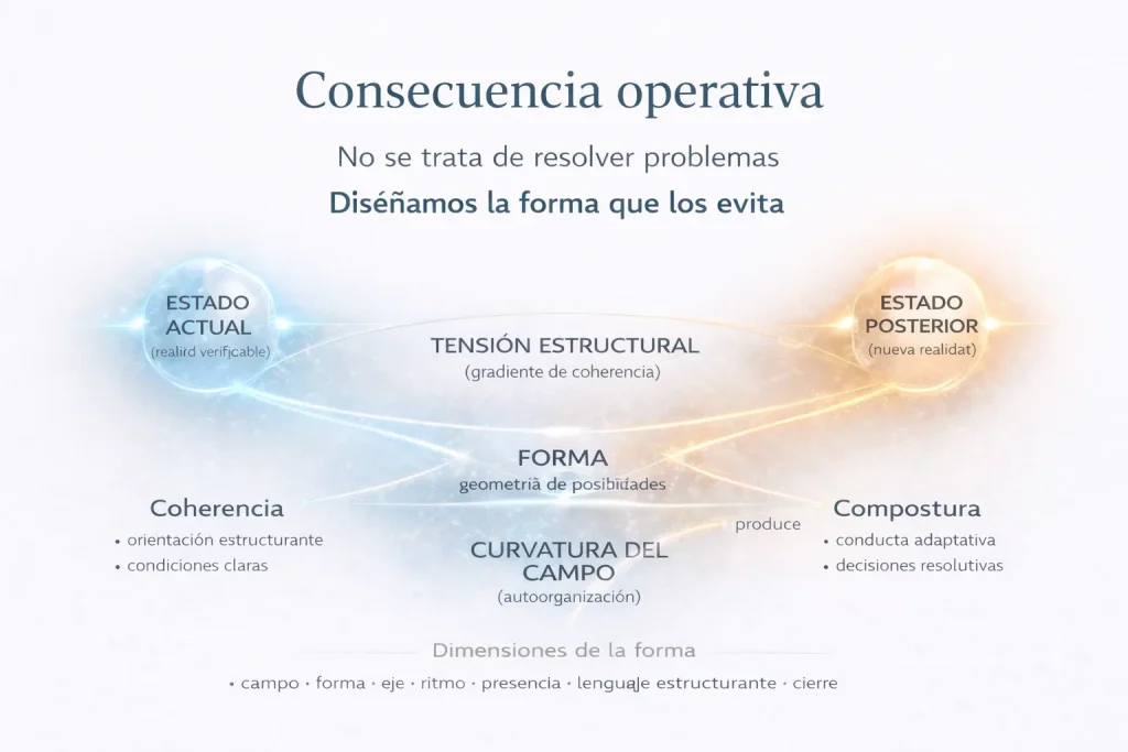 Esta diferencia no es evidente en el momento en que se introduce la forma. De hecho, muchas formas parecen correctas en el corto plazo. Resuelven una parte del problema, generan alivio, permiten avanzar. Pero si no modifican la configuración de manera compatible con la dirección de cambio del sistema, ese alivio es temporal. La tensión reaparece, a veces en otro punto, a veces con mayor intensidad.
