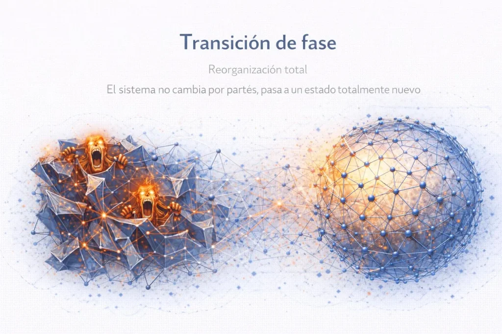 También explica por qué la transición no es gradual en el sentido clásico. No es la suma de pequeños cambios que, acumulados, generan un resultado. Es el momento en el que esos cambios se integran en una nueva configuración que funciona como conjunto. Antes de ese punto, el sistema está en proceso. Después, está en otro estado.