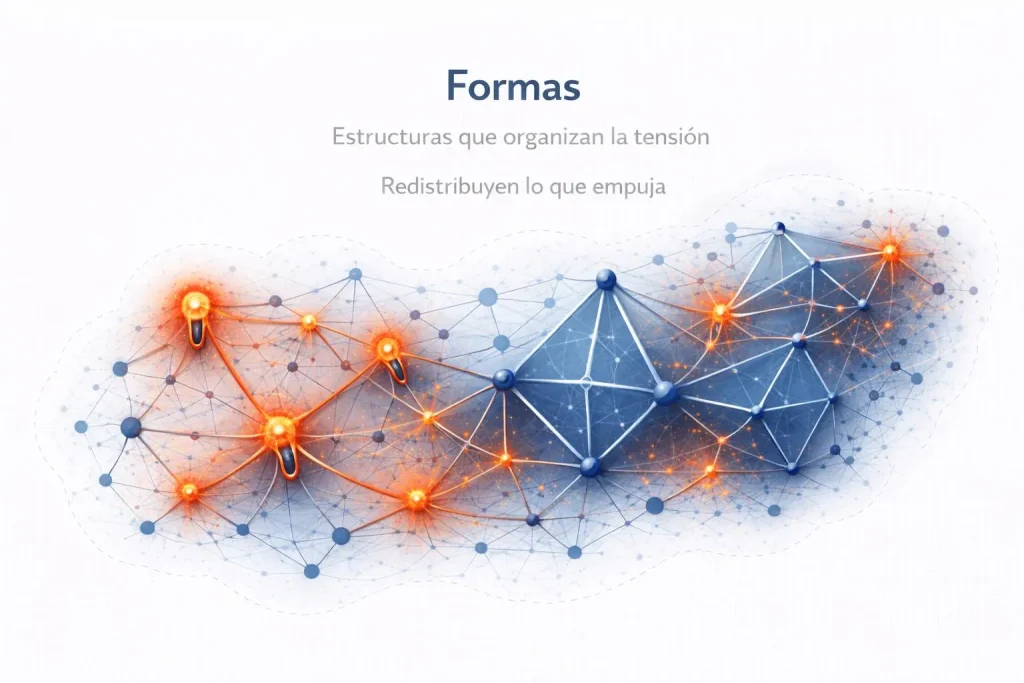 La intuición habitual es que las formas resuelven problemas. Se diseñan estructuras para corregir disfunciones, se introducen mecanismos para eliminar tensiones, se ajustan relaciones para recuperar estabilidad. Pero este modo de verlo es engañoso. Las formas no eliminan tensiones. No “arreglan” el sistema en el sentido clásico. Lo que hacen es algo distinto y mucho más estructural.