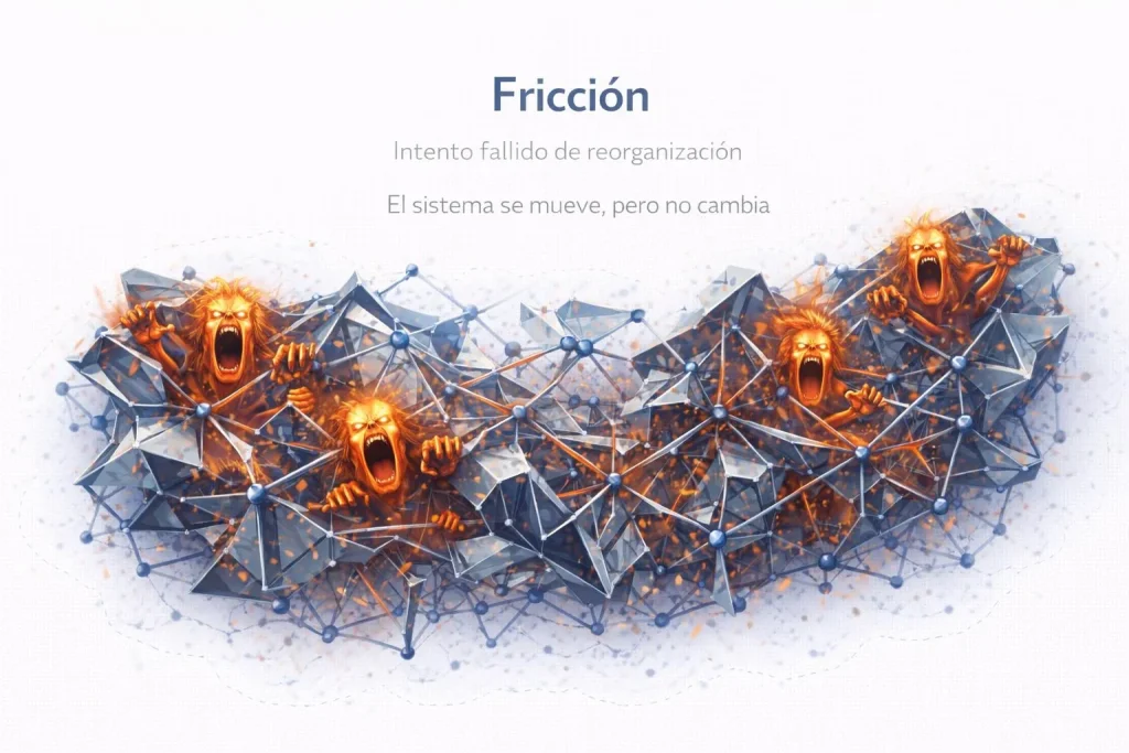 En este punto, el lector suele tener la sensación de que ya entiende lo que está ocurriendo. Ve tensiones, ve formas, ve decisiones. Sin embargo, todavía falta una pieza para completar la lógica. Porque cuando las formas no consiguen organizar el cambio, no solo reaparece la tensión. Aparece algo distinto, más difícil de gestionar, más costoso y, sobre todo, más visible: la fricción.