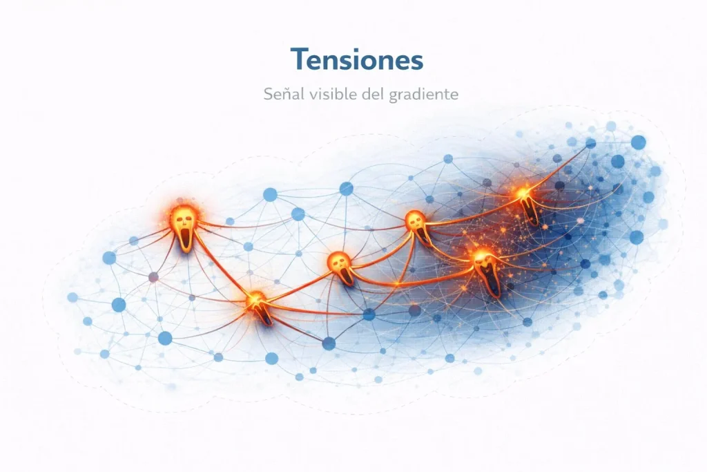 Sin embargo, como el gradiente no es visible directamente, el sistema solo puede percibirse a través de sus señales. Y es precisamente en esas señales donde suele centrarse el análisis tradicional. Se observan conflictos, bloqueos, dificultades, sin ver que todos ellos están apuntando hacia algo más profundo: la existencia de una dirección de cambio que la configuración actual no consigue sostener.