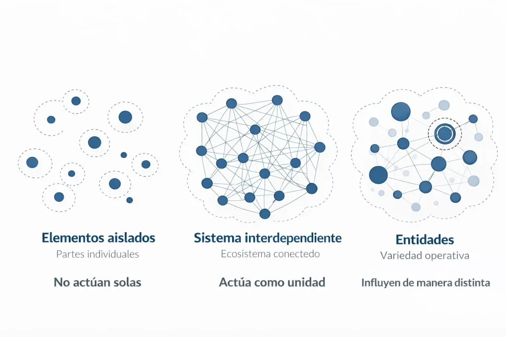 Este cambio tiene una consecuencia importante. El número de entidades relevantes no es fijo ni predeterminado. Depende del nivel de análisis y del tipo de configuración que se esté observando. En algunos casos, bastará con unas pocas entidades bien identificadas; en otros, será necesario incluir elementos que normalmente no se consideran parte del análisis, pero que resultan determinantes para entender lo que está ocurriendo.