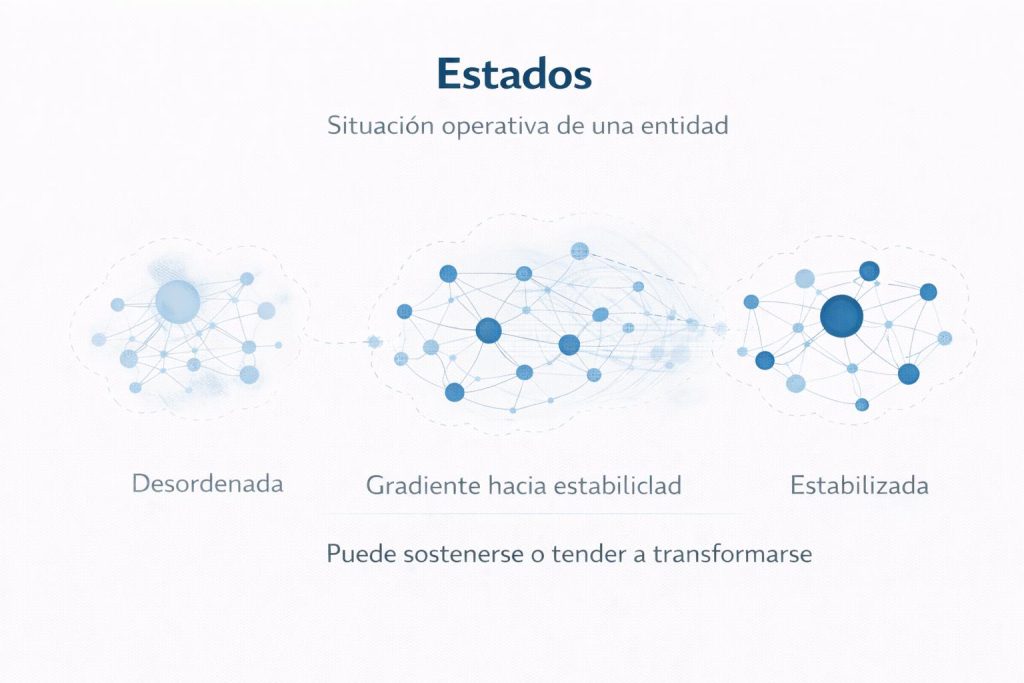 Un estado, en cambio, no es una propiedad estática, sino una situación operativa efectiva. Es la forma concreta en la que una entidad participa en la realidad del sistema en un momento dado. Y esa situación tiene una característica fundamental: puede sostenerse o puede tender a transformarse.